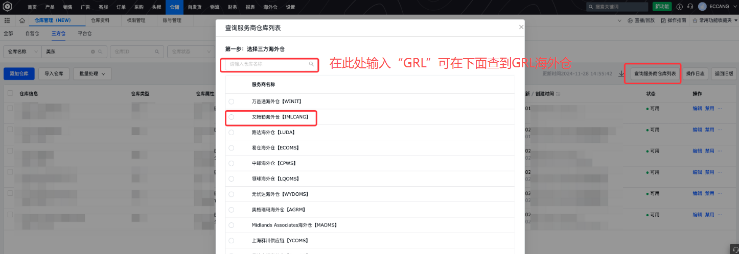 GRL仓储管理系统已经和易仓ERP对接了海外仓一件代发业务。易仓ERP的具体配置如下: ## 系统对接授权 ### 添加海外仓服务商 路径:仓储》仓库设置》海外仓服务商;  点击“添加”按钮,搜索“GRL”可找到GRL海外仓,添加之后就可在左边的服务商列表中看到“GRL海外仓”。  ### 增加仓库和授权 **Step1:点击「查询服务商仓库列表」** 仓储》仓库管理页面,三方仓页签下点击“新增”,输入“GRL”可查到GRL海外仓,勾选海外仓,点击「下一步」。  **Step2:填写三方海外仓的授权信息** 海外仓授权可在OMS申请并查看,具体请参考《[开发者信息](https://help.wlwytech.com/project-8/doc-234/ "开发者信息")》,授权信息映射关系请见下图。点击“确定”,易仓ERP会继续获取GRL的所有仓库。  **Step3:勾选具体的海外仓** GRL有多个仓库,选择您需要使用的海外,勾选后,点击「确定」即可。  以上信息可在易仓ERP的操作指导中找到,具体请见《[易仓ERP仓库管理](https://home.eccang.com/#/company/helper/center?docId=111938 "易仓ERP仓库管理")》,此链接需要登录易仓ERP系统查看,用您的易仓账号登录即可正常浏览。